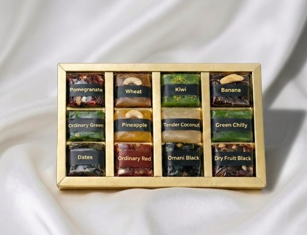 This exclusive collection brings together a vibrant assortment of traditional and exotic flavors including fruity, nutty, and classic varieties — offering something special in every bite. From the deep richness of black halwa to refreshing fruit-infused selections, each piece is carefully prepared to ensure authentic taste, perfect sweetness, and signature chewiness that Kozhikode halwa is famous for.