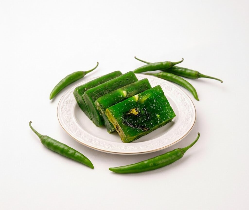 Each glossy green cube is perfectly cooked to achieve a chewy texture and a balanced flavor profile — spicy, sweet, and incredibly satisfying. Ideal for those who love experimenting with *unique Indian sweets* that break the ordinary.