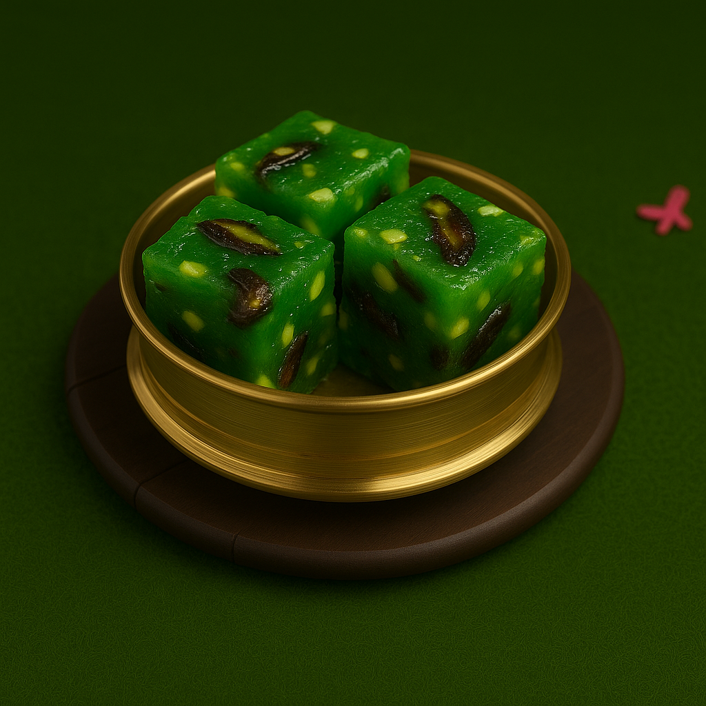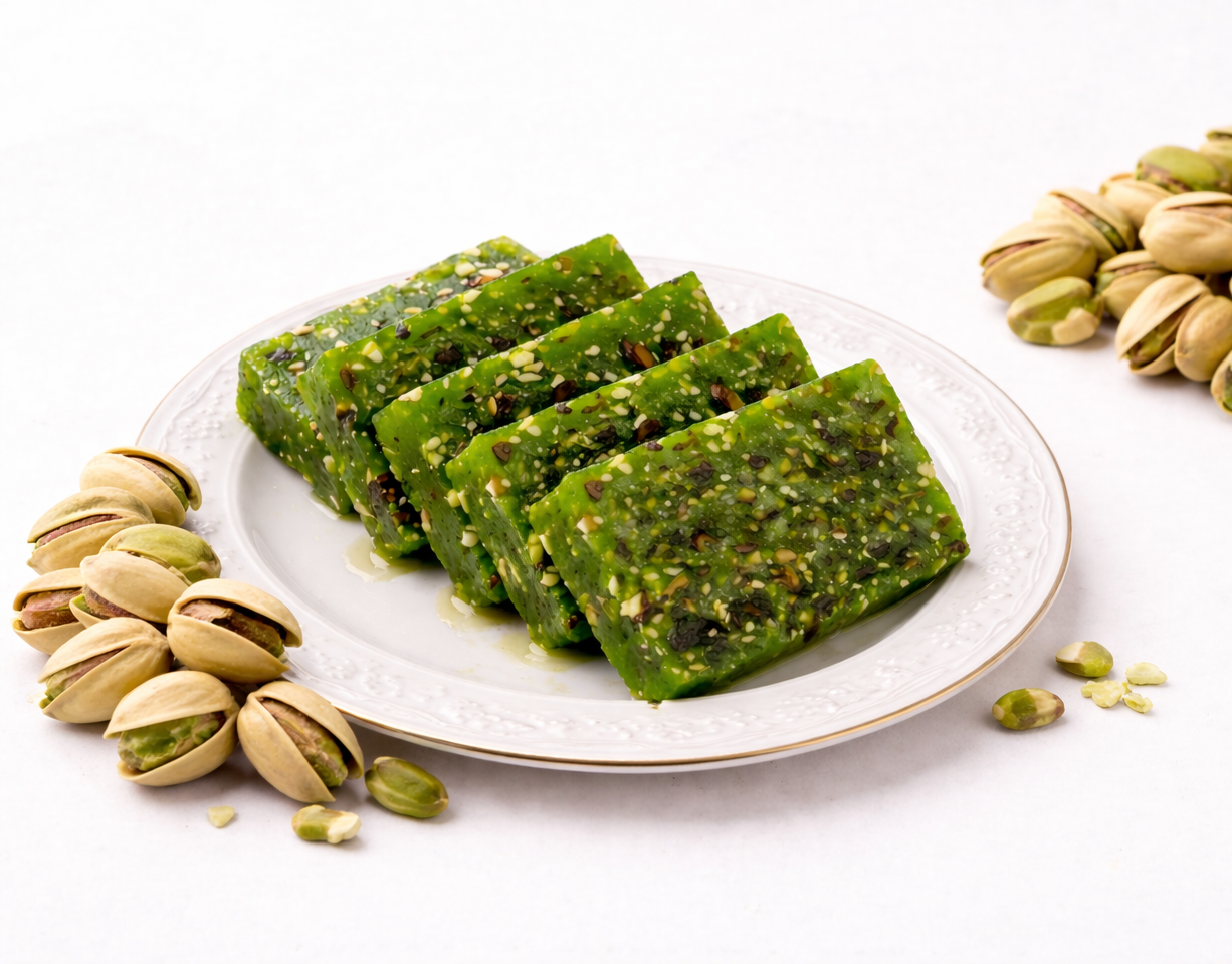 Each cube is packed with crunchy pista pieces, blended beautifully into a smooth, melt-in-the-mouth halwa that delivers a truly royal dessert experience. Its striking green colour and glossy finish make it not just delicious—but visually irresistible.