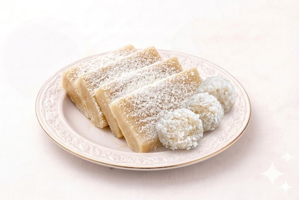 Crafted with rich coconut essence, smooth halwa texture, and topped with crunchy almonds and delicate coconut flakes, every bite delivers a perfect balance of sweetness and nuttiness. The soft, glossy texture and aromatic flavor make it a truly indulgent treat for sweet lovers.