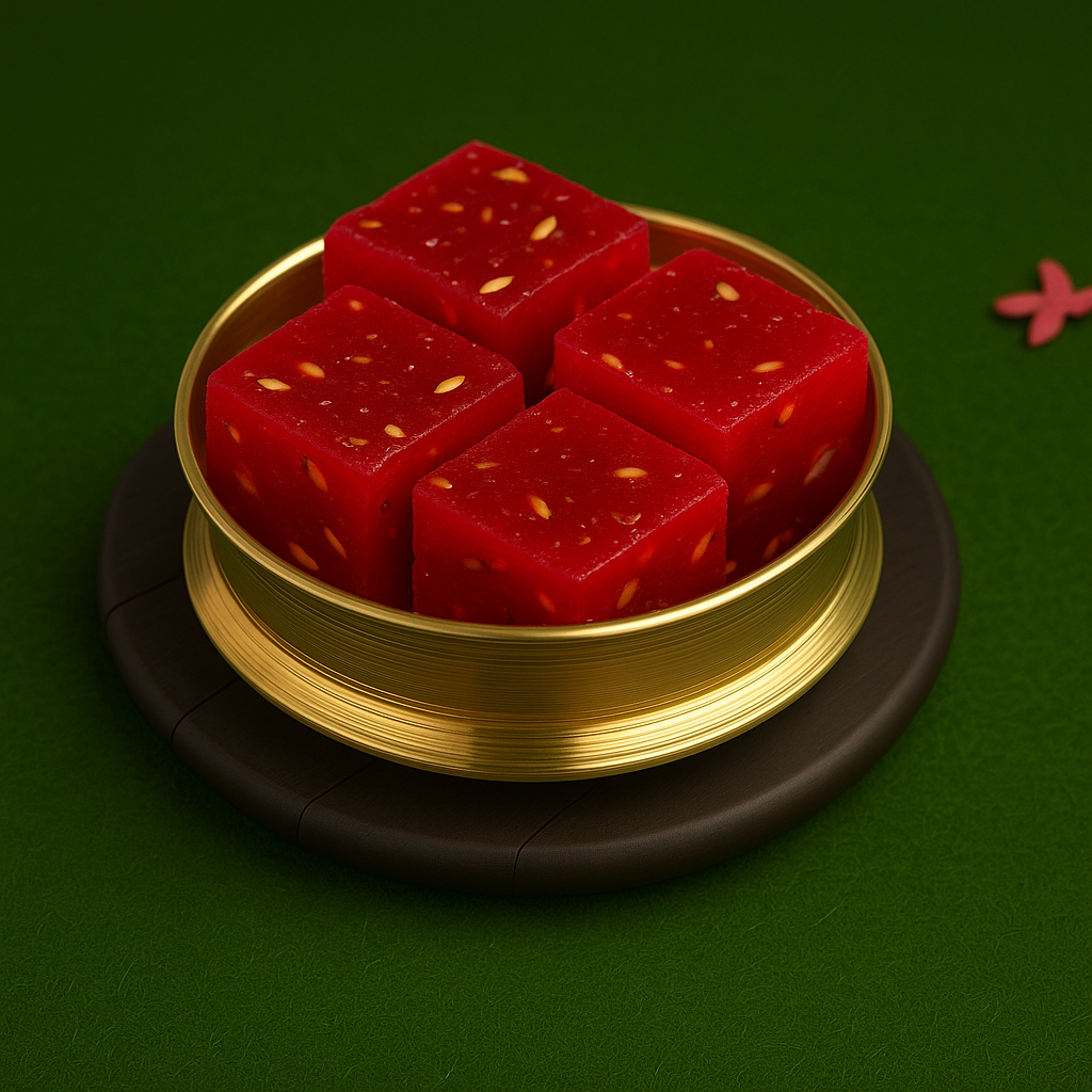 Indulge in the vibrant taste of our Watermelon Halwa, a unique fruit-based sweet crafted with real watermelon pulp, pure ghee, and premium nuts. Each bite delivers a juicy, refreshing flavour that perfectly balances sweetness and richness. Its bright red colour and soft, chewy texture make it a standout dessert for any occasion.